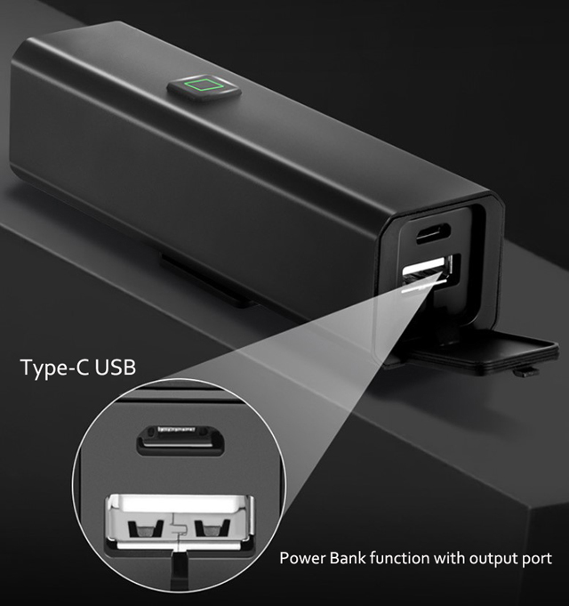 1). Two kind of beam for choice: Full beam, or Anti-glare Beam. 2). 1800LM, OSRAM LED. 3). 4500mAh battery, big capacity. 4). Type-C USB charge. 5). Size: 11.6 * 3 * 3cm. 6). Power indicator: 80% - 100% in green, 30% - 80% in blue, less 30% in red. 7). Run time: 1:50 H - 8:30H. 8). Material: Aluminum alloy. 9). Input/Output: 5V 2A. 10). Output used as power bank for emergency. 11). Waterproof IP66.