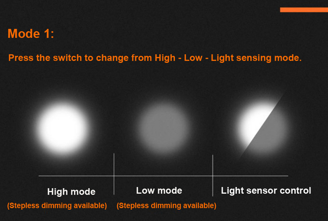 2). Modes 1: High - Low - or Stepless dimming control for brightness.
