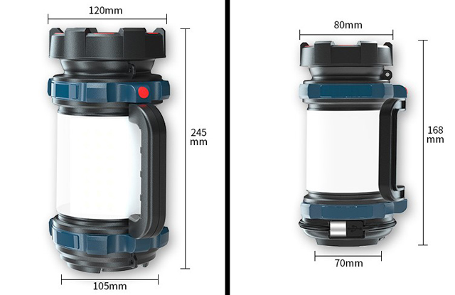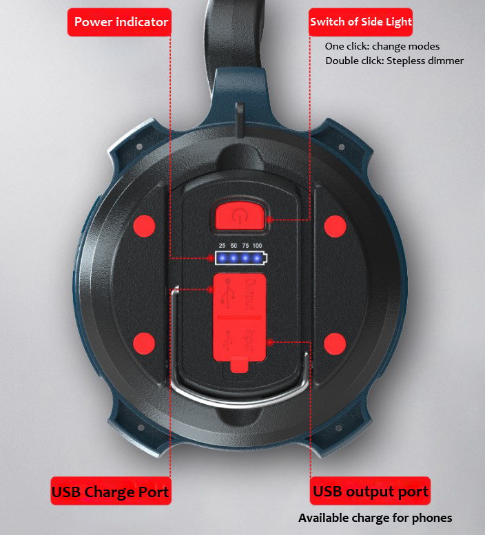 Brief : 1). LED: L2LED+60LED for small size, and P50LED+84LED for big size. 2). Charging method: Rechargeable. 3). Battery: 2400mAh for small size, 4800mAh for big size. 4). Multi function: Camping Lantern, LED Torch, Warning Red Light, Power Bank.