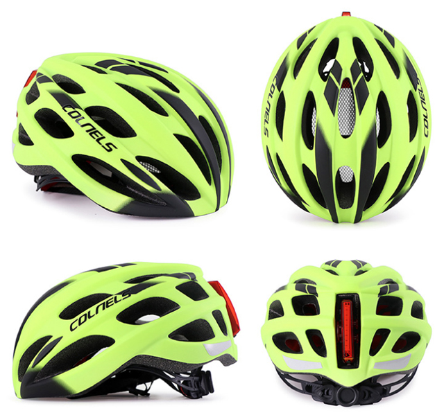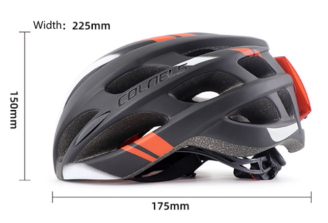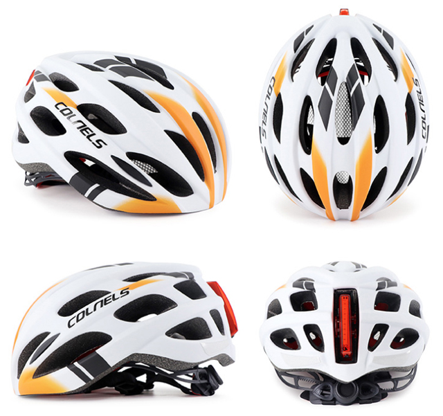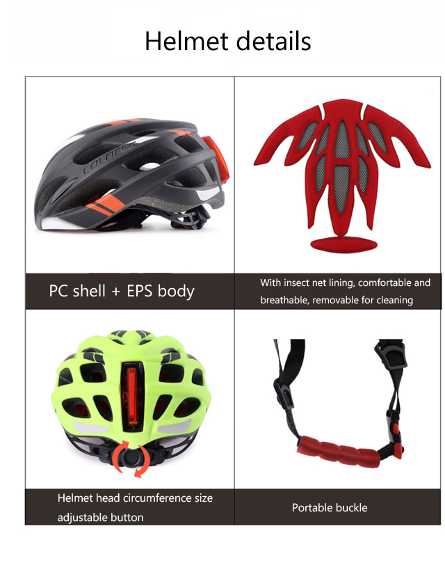 1). Material: PC + EPS 2). Size: L (weight 235g, 18*23*15cm). 3). Bright Tail warning LED, 6 modes. 4). Vents: 25pcs 5). For head circumference: 58-62cm 6). head circumference adjustable: YES 7). Colors: Black with white/ White with orange / Black with white / Blue with black / Yellow with black.